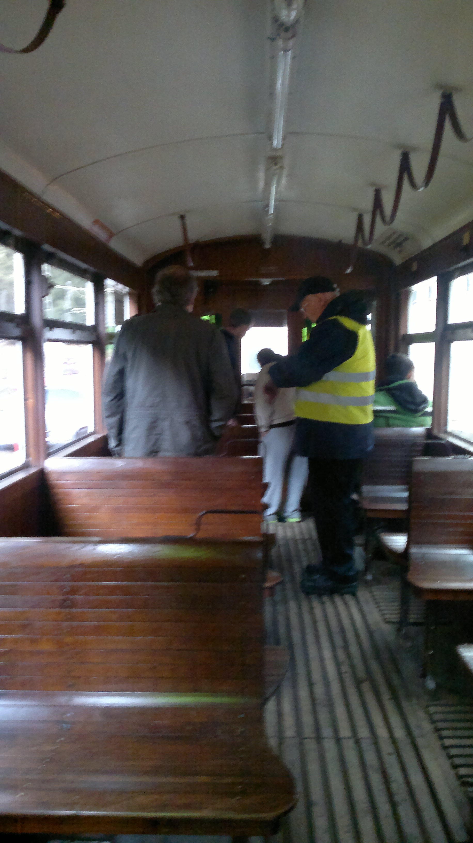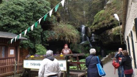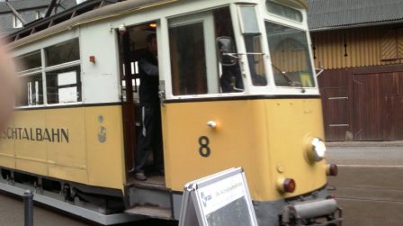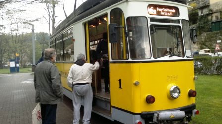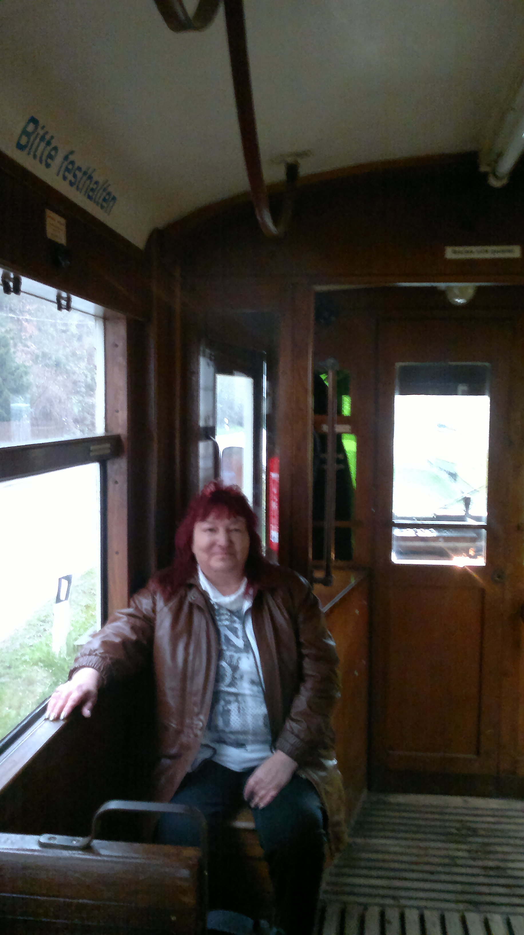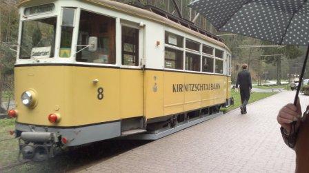 Im Zug wurden wir nin Gruppen eingeteilt für die Fahrt mit Historischen Wagen der Kirnitzschtalbahn, wir waren in Gruppe drei und das war gemütlich denn wir waren nur ca. 6 oder 7 Personen. Da wir mal auf´s Kloh musten verpassten wir den Shuttel - Bus zur Strassenbahn aber wir nahmen ein Taxi der Fahrer erzählte uns auch einige interessante Sachen über die Gegend und so hatten wir jetzt viel Zeit bis unser Sonderzug der Kirnitzschtalbahn fuhr, diese nutzten wir um in einer Gaststätt zum Mittagessen einzukehren. Gegen 13 Uhr ging dann die Fahrt im Historischen Triebwagen los zur Endhaltestelle Lichtenhainer Wasserfall. Hier hatten wir fast zwei Stunden Aufenthalt und so konnten wir gemütlich den Tag hier geniessen. wir gingen in die Gaststätte und tranken Bier und Königsteiner Berggeist. Dann war die Zeit ran wo wir uns zur Haltestelle begeben musten um unsere Rückfahrt nicht zu verpassen. Wir staunten nicht schlecht als der Älteste Restaurierte Triebwagen einfuhr.