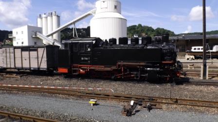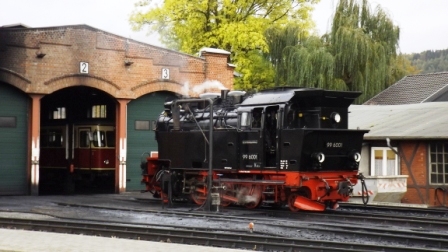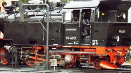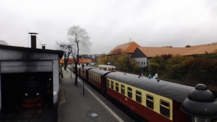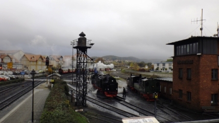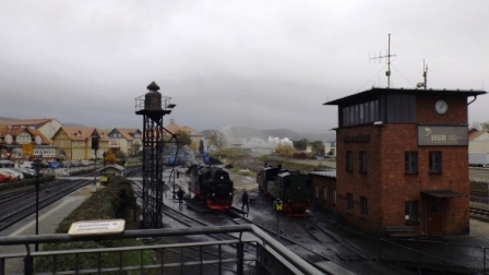 Lok 99 6001 in Gernrode kurz vorm Rangieren. Das Wetter war bestens Sonnenschein pur. Um 9,46 Uhr ging dann die Reise los bis Eisfelder Talmühle wo wir wieder in den Zug aus Nordhausen kommend umsteigen und dann in Drei annen Hohne in den Zug nach Wernigerode steigen. In ETm fing es leicht zu nieseln an naja bis Wernigerode ist ja noch ne weile. Als wir in Drei Annen Hohne ankamen schien dort auch noch die Sonne aber das änderte sich dann auch sehr schnell, wir nahmen eine kleine Mahlzeit am Imbis ein und ich nahm wieder zwei Flaschen Bier mit dann ging es ab nach Wernigerode. Wir genossen die Fahrt und in wernigerode hatten wir über eine Stunde Zeit die wir überbrücken mussten aber das bei Nieselregen. ich machte dann ein Video von der Ausfahrt eines Sonderzug zum Brocken und Fotos von dem Betriebswerk.
