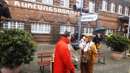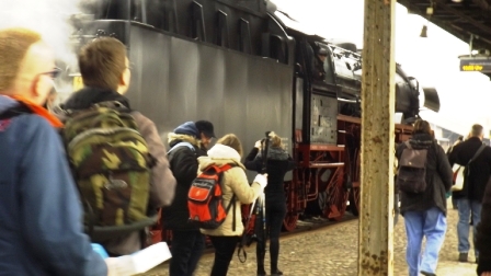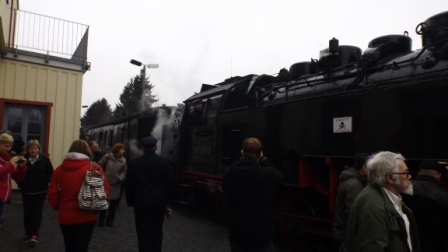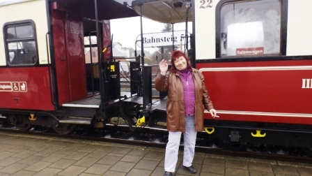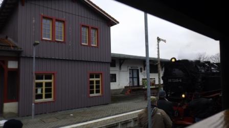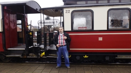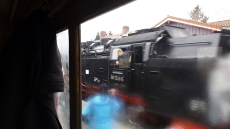 Es ging früh los von Schöneweide, wir hatten ein Abteil erster Klasse gebucht und so konnten wir ganz bequem die Fahrt geniessen. Zur Frühstückszeit gegen 9 Uhr begaben wir uns in den Speisewagen und bestellten uns Kaffee und Rüherei mit Schrippe nach dem Essen tranken wir noch ein Sekt und begaben uns dann wieder auf unsere Plätze und nahmen noch ein Fläschchen Bier mit, so verging die Zeit und wir kamen in Quedlinburg an, von wo aus dann die Harzrundfahrt nach Wernigerode losging. Geplant waren einige Scheindurchfahrten da hielt ich mich aber raus, wir blieben lieber im warmen Zug sitzen. Bespannt mit 99 7237-3 kam dann in Quedlinburg der Traditionszug der HSB eingefahren und wir konnten die Fahrt durchs Selketal geniessen. Auf der Strecke machten wir öffters halt zum Wassernehmen und natürlich auch für Scheindurchfahrten. Am späten Nachmittag kamen wir dann in Wernigerode an wo dann der "Kampf" um die Spaisewagen los ging denn die HSB hatte keine Bewirtung in dem Zug. Nach zweimaligen Erfolglosen versuch einen Platz im Speisewagen zu ergattern gab ich es auf. Elke holte uns Würstchen und Bierchen und wir hatten wenigstens etwas im Magen. Ich habe auch nur einige Fotos von der Fahrt gemacht da wie immer viele Menschen die Loks umlagern und mann keine Chance hat wenn mann zu weit von der Lok im Wagen ist noch mit in der ersten Reihe zu stehen.